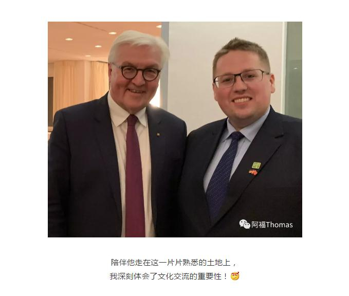此外,阿福於2018年12月應邀全程陪同德國總統弗蘭克-瓦爾特·施泰因邁爾(Frank-Walter Steinmeier)訪問中國。期間,他特意選了10年前他來中國一樣的路線,希望總統能親眼目睹這10年中國的巨大變化。他非常感恩有這樣的機會,也深刻體會到了文化交流的重要性,希望自己繼續為兩國的友好發展作出一份微薄的貢獻。
