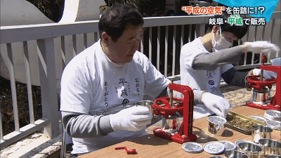 1.準備空罐頭 2.然後在空中揮舞充分收集空氣 3.放一枚印有平成年代的5日元硬幣 4.最後拿專用的機器將其封起來 5.貼上提前印好的包裝紙