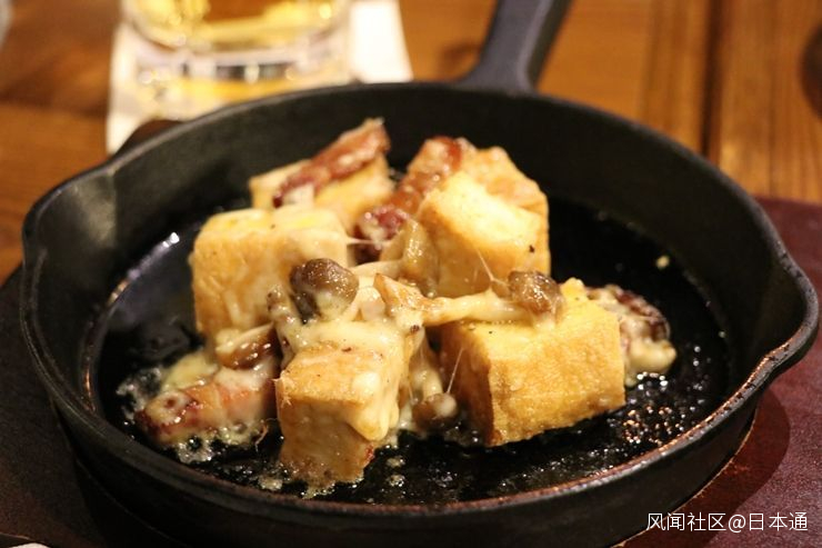微炸的軟軟的油豆腐塊點綴上略炸的臘肉和奶酪。