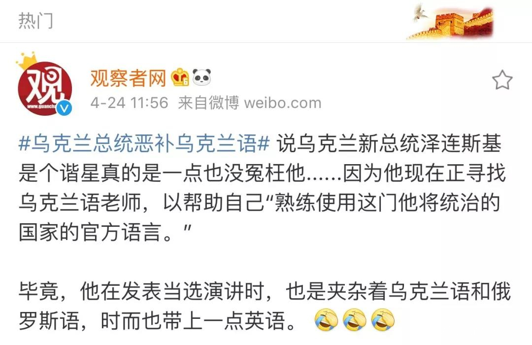 最扯的是,烏克蘭總統之前有次講話中忘了烏克蘭語怎麼説“錢包”,只好問秘書,秘書説了好幾遍他才聽懂,而且詢問秘書的過程中全程俄語,非常尷尬。這幾天新上任的喜劇演員總統正在非常認真地學烏克蘭語,你們感受下: