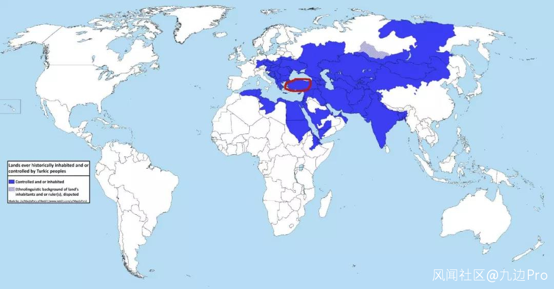土雞就不用説了,土雞就是土耳其,完全一神經病,他們把自己的祖先定為突厥人,這一點對土耳其很重要,而且土雞還有一個奇葩邏輯,認為突厥歷史上佔領過得領土都是土雞的,突厥人佔領過得地盤有多大呢?下圖那麼大,藍色的都是突厥人染指過得,大家注意下,其中包括我國新疆、蒙古、東北,那個説的是唐朝時期的東西突厥,圖中紅圈是土雞現在的面積: