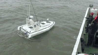 第三個難點是這樣的,因為無人艇的航行距離只有幾百公里,如果進行遠海航行作業的話,必須要跟母艦配合着使用。可是在海上,正所謂無風三尺浪,三級四級的海風是很常見的,無人艇作業完成了之後,再回到母船一直是很困難的事情,美國也在研究這方面的問題。大船晃得很厲害,無人艇也晃得很厲害,讓兩邊的吊鈎結合對接,把無人艇吊上來,難度非常大。