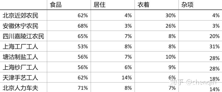 六成的支出花在食品和居住上以後,剩下的消費主要是衣着、燃料和其他雜項消費。