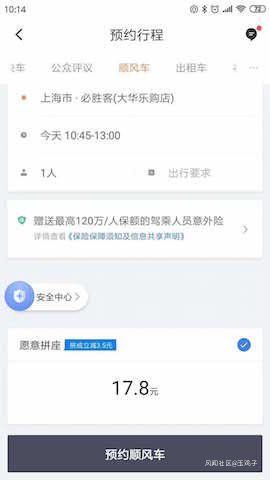 今日,界面新聞拿到一張截圖,圖片信息中,上海用户已成功顯示順風車預約界面及價格。順風車的入口位於公眾評議右側。而據滴滴官方表示,公眾評議於去年11月2號正式上線,會不定期出現在滴滴的APP內。