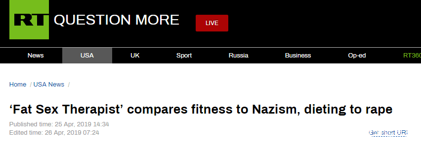 RT説,這名女子在表達了“不應節食”的觀點後,還試圖將新西蘭清真寺槍擊案兇手的暴行和他“對身體健康的熱愛”相結合。