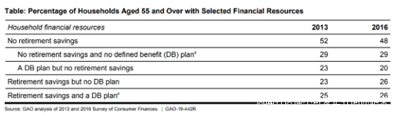 根據2016年美國退休儲蓄報告,29%的人既沒有僱主給他們交過養老金,也沒有自己交過養老金。而20%的人雖然沒有自己存入養老金,但是加入了養老金固定收益計劃,即可以享受僱主為他們曾經按月繳納的養老金。但這一比例較2013年下降了3個百分點。