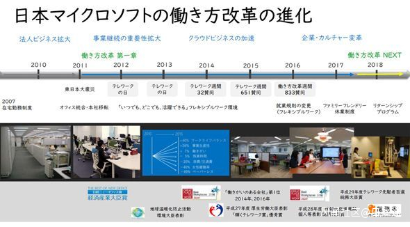 伴隨着日本工作方式改革法的執行,日本企業尋求多種的工作方式變得異常活躍,微軟日本在這方面就非常積極。2007年開始試行在家工作制度,2011年開始全面推進工作方式改革等,是致力於改革領域的領先公司。