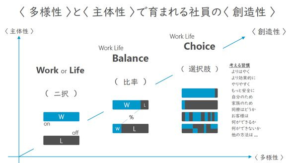 工作和私生活到底該如何選擇,可以説是一個二選一的陳舊話題了。將工作和私生活的平衡設定為主體的“工作生活平衡”的思想逐漸發生改變。更進一步的計劃就是,針對每一名職員的工作和生活情況,推進可以自行選擇工作環境的工作方式,可以提高員工個人的生產效率和創造性。