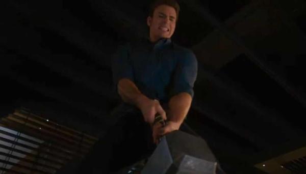 在《復聯2》(2015)裏有一個搞笑橋段,雷神舉辦了一場舉錘比賽,看誰能舉起他心愛的小錘錘,鷹眼、鋼鐵俠、綠巨人先後登場,錘子紋絲不動,而美隊一握,錘子似乎動了一下,鏡頭立刻給雷神一個特寫,後者的臉色都變了。