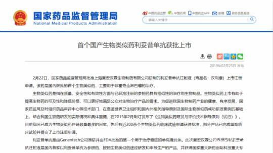 所謂生物類似藥,是指在質量、安全性和有效性方面與已獲准註冊的參照藥具有相似性的治療用生物製品。國際和國內法規要求:生物類似藥在蛋白質的一級結構(氨基酸序列)上應與原研藥一致,還需要和原研藥在生物學活性、臨牀前研究、臨牀研究等方面保持高度相似。生物類似藥上市有助於提高生物藥的可及性和降低價格,可以更好地滿足公眾對生物治療產品的需求。 針對漢利康的上市對整個生物醫藥行業的意義,中國醫藥創新促進會執行會長宋瑞霖表示:“首個生物類似藥獲批,在醫藥創新和行業歷程中具有里程碑式意義。隨着中國藥品監管制度改革的不斷深化,藥品審評審批效率、監管水平的大幅度提高,生物藥獲批的過程會越來越順暢。”