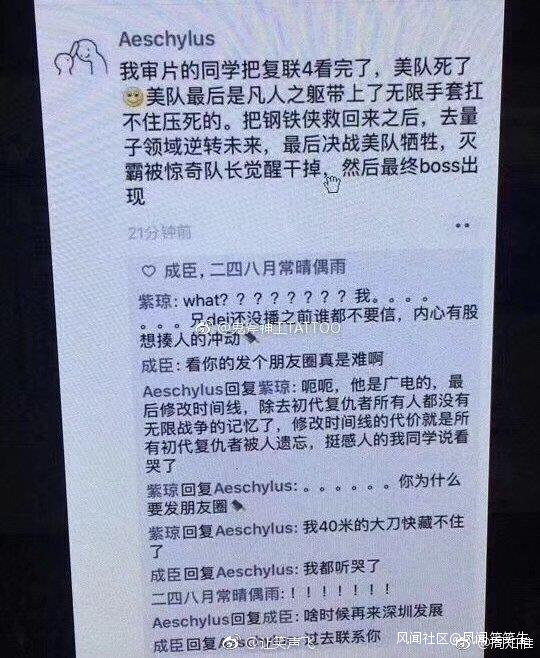 除此之外,《復仇者聯盟4》是第一部影片還沒開映,關於劇透的花邊消息就滿天飛——比如有一段境外版的《復聯4》盜錄片段在網上流傳;還有一條廣泛流傳的朋友圈,這條朋友圈裏説自己朋友是負責審電影的,已經提前看了劇情。