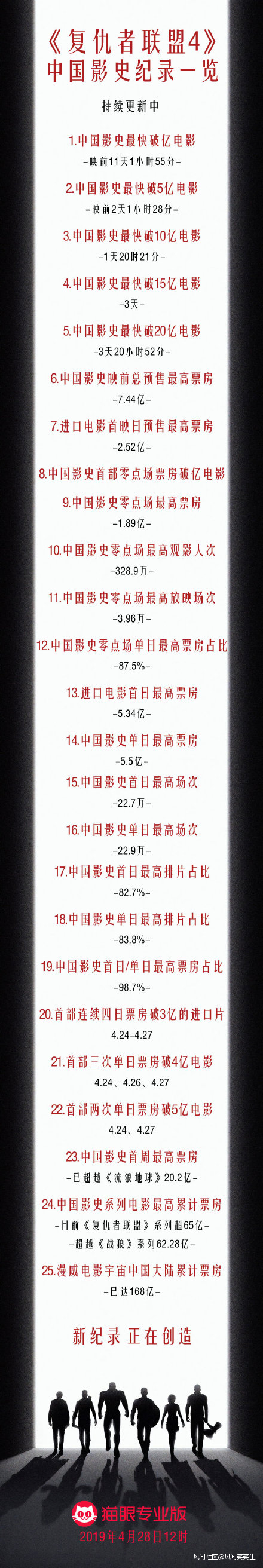這部電影確實取得了很多成績,打破了中國影視的很多記錄,比如貓眼電影就專門只做了一張長圖,裏面列舉了《復仇者聯盟4》打破的25箇中國影史的記錄。