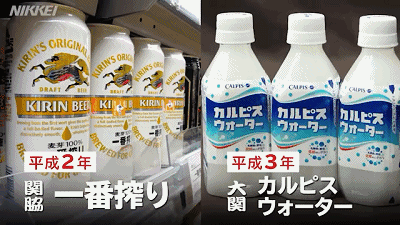 在現在的超市便利店就可見到的麒麟啤酒和可爾必思,其實是平成2年開始販賣的,如今依舊是熱賣的飲品。