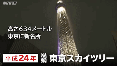 2012年東京天空樹建好了,高達634米,成為日本最新的標誌性建築。用了3年8個月建成,於2011年由吉尼斯世界紀錄認證為"世界第一高塔"。