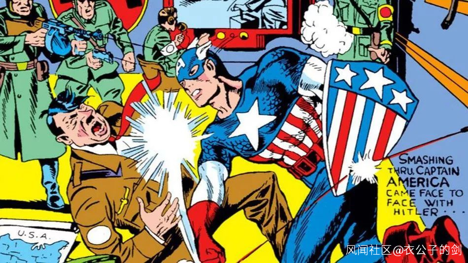 1941年,當時還叫及時漫畫(Timely Comics)的漫威推出了自己的超級英雄——美國隊長(Captain America),創刊號的封面是美隊一拳打在希特勒臉上,憑一己之力生擒戰犯,結束戰爭。第二次世界大戰尚在進行之中,憑藉一種中國抗日神劇的方式,美國隊長成為風靡全美的二戰英雄,每期可以賣出50萬冊。