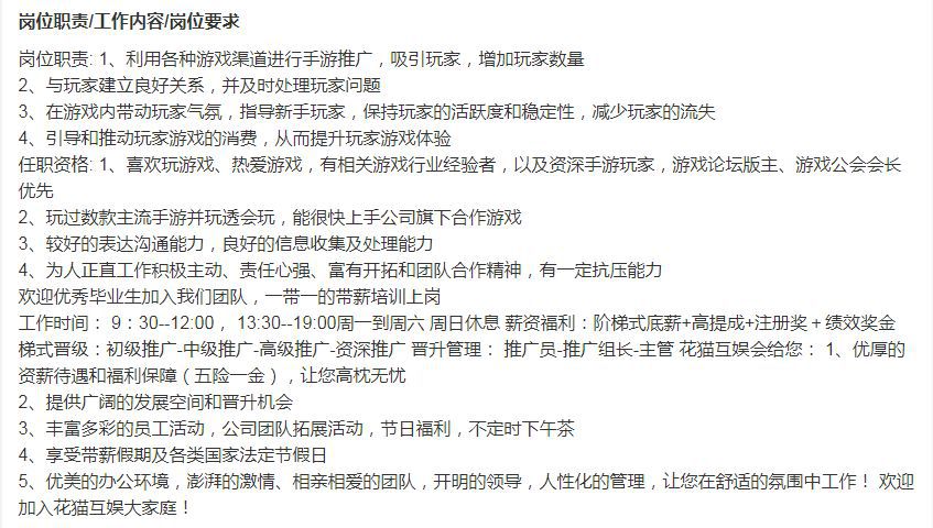 資料顯示,推廣員的工作內容主要是在遊戲中與玩家建立關係,保持玩家活躍度,降低玩家流失,並通過各大渠道推廣遊戲。從招聘信息上來看,花貓互娛的“推廣員”們工作內容“還算正常”,讓人難以聯想到上述新聞中因詐騙而被警方查處的花貓互娛。