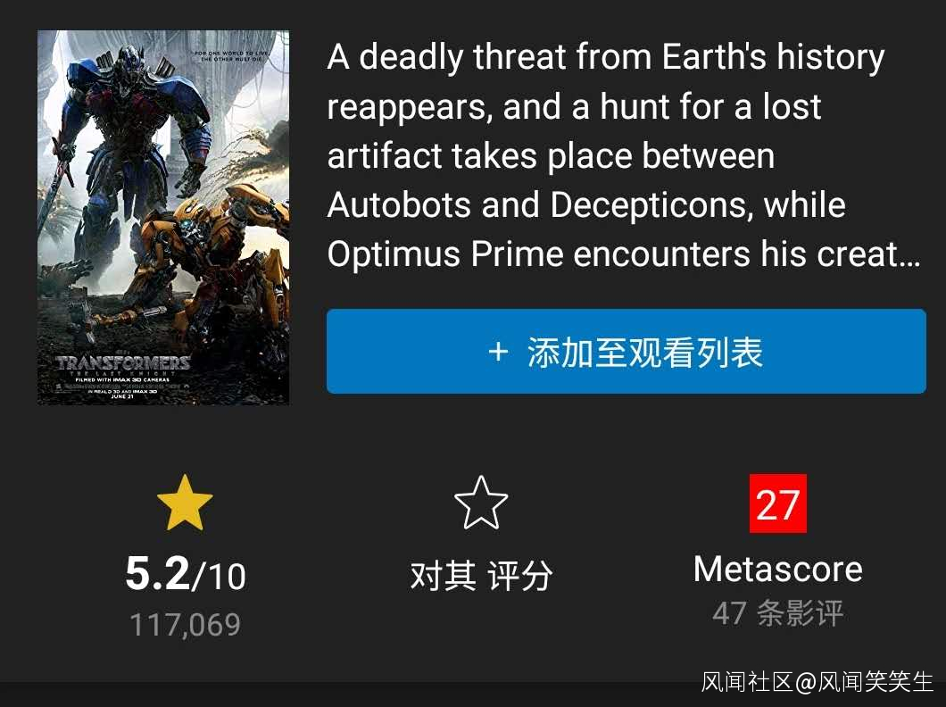 但需要説的是,中國電影市場,是一個很神奇的市場,《變形金剛5》的口碑雖然很爛,但是該賺的錢一分沒少賺。在2017年中國內地電影票房榜上,《變形金剛5》以15.5億的票房,位列第6位,而當年的票房冠軍,是《戰狼2》。