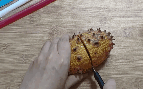 到手一看,火星果這麼硬且尖刺密佈,咋吃呢?削皮是不可能削皮的,直接咬更不可能。根據老司機提供的食用指南,最正常的方法就是把火星果切兩半,用勺子或者比較粗的吸管去吸食它的果肉。