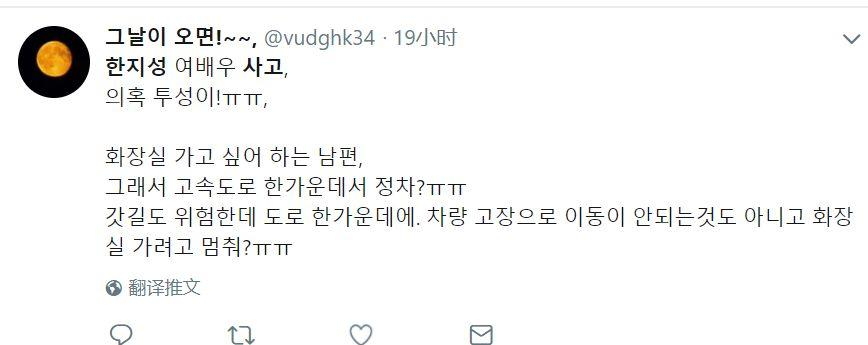 女演員韓智星的事故疑點太多了!丈夫想上廁所,就把車停在高速公路中間?應急車道都很危險,更何況是道路中間。也不是因為車輛故障沒法開了,就因為要上廁所就停?