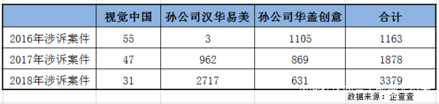 《每日經濟新聞》記者通過企查查統計發現,2017年到2018年,視覺中國及其旗下漢華易美、華蓋創意三公司涉及的知識產權糾紛案(裁判文書包含一審、二審及執行判決,下同),每年都以千計。
