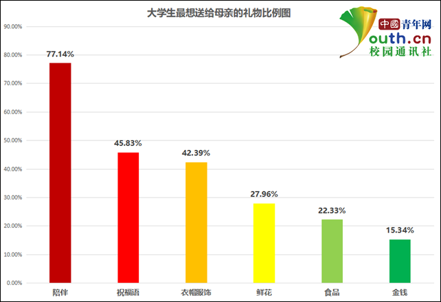 在母親節,大學生會給母親送禮物嗎?根據中國青年網記者調查,81.59%的大學生會選擇在母親節給母親送禮物。那麼,最好的母親節禮物是什麼呢?有77.14%的大學生選擇“陪伴”,其次是“發送祝福語”和“購買衣帽服飾”,分別佔45.8%和42.39%。