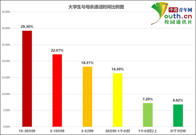 與母親的日常通話時長是多久?中國青年網記者瞭解到,52.8%的大學生與母親的通話時長超過10分鐘,其中,10到30分鐘的為29.3%,30分鐘到1個小時的為16.3%,1個小時以上的為7.2%。