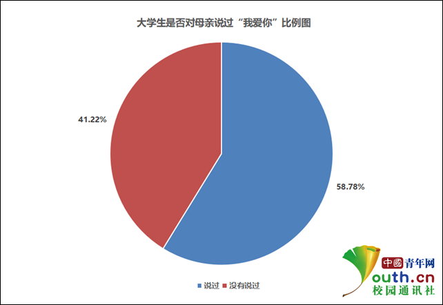 在日常生活中,有沒有主動對母親説“我愛你”呢?調查顯示:58.78%的大學生曾對母親説過“我愛你”,41.22%的大學生則表示從來沒有説過。