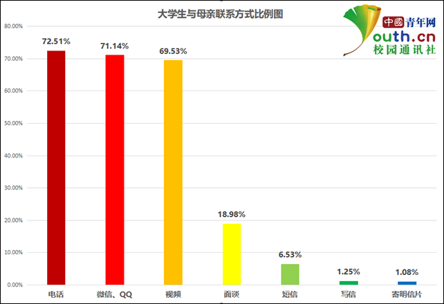 那麼,大學生主要通過什麼方式跟母親聯繫?調查顯示,電話、微信QQ、視頻是主要方式,分別有72.51%、71.14%、69.53%的大學生選擇;其次是選擇當面和母親談話和用短信聯繫,分別佔18.98%和6.35%。