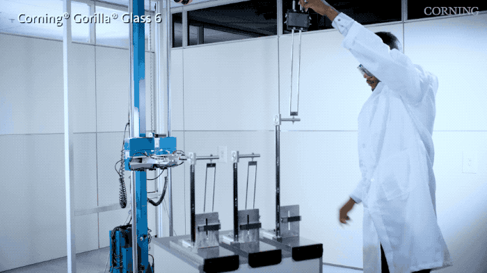 在硅谷的康寧科技中心裏,康寧的工作人員為我們演示了多個玻璃測試環節。其中一項為「跌落測試塔」,塔的下方會放一張 180 目的砂紙,用於模擬現實生活中的跌落粗糙表面,比如瀝青和水泥,玻璃則需要經歷不同高度的垂直跌落,和我們在手機工廠中看到的跌落測試十分相似。