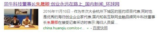 2016年,朱晟卿成立了互聯網理財品牌“牛犇犇”,年終成立了國內領先的金融科技解決方案提供商——浙江同牛網絡科技有限公司。