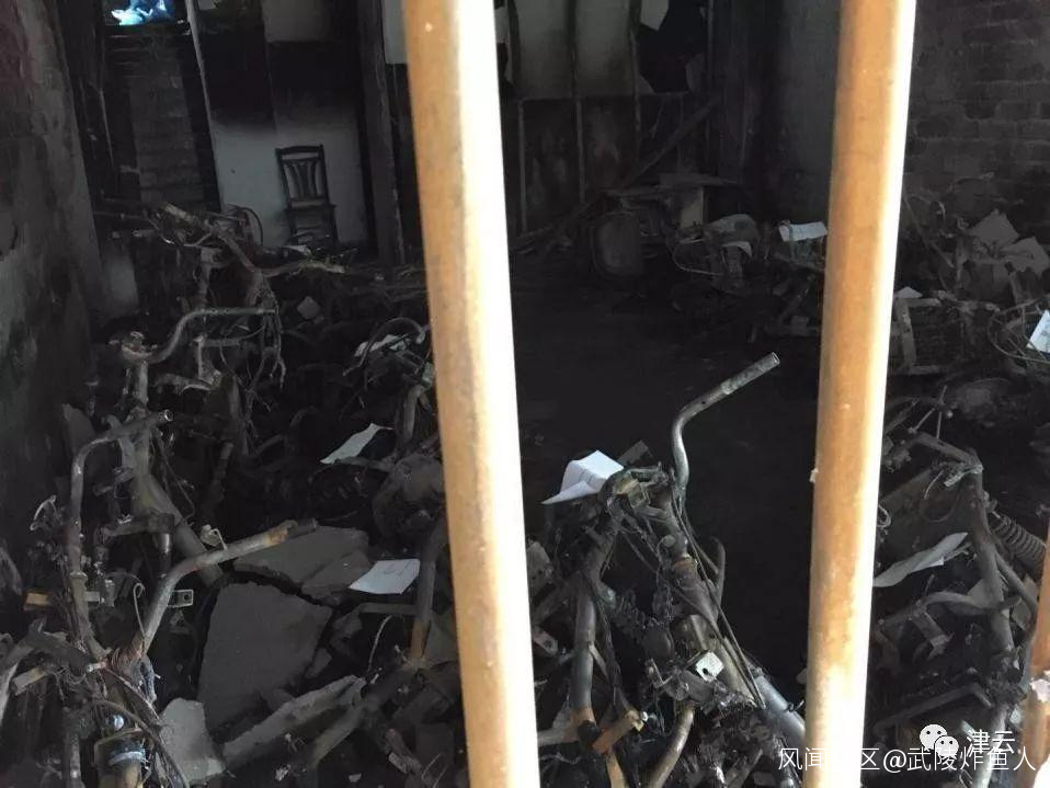 後門內一樓的公共空間裏面堆放了約二十輛被燒焦的電動車。“起火前應該是有電動車在充電,使用的充電器材規格不對,電瓶爆炸了,繼而引爆了約二十輛電動車。” 事發民房對面商户林明告訴津雲記者,“這棟樓租住着五六十個人,大多是廣西師範大學灕江學院的學生,經營者也住在這裏,這些電動車應該是他們的。”