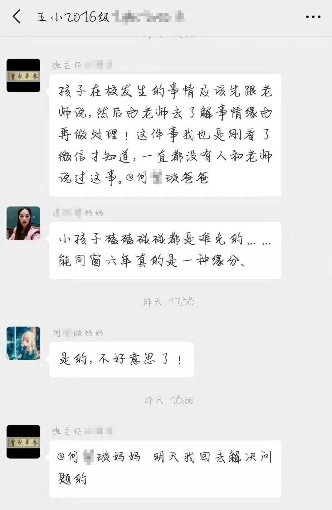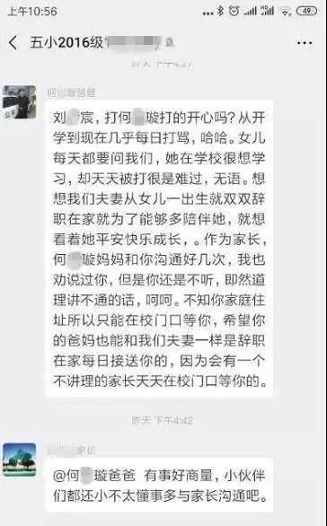 網上流傳的多張截圖顯示,案發前,在一個名為五小某班的班級微信羣中,暱稱為何某某爸爸的羣成員針對劉某宸發信息稱,“劉某宸打何某某開心嗎?從開學到現在幾乎每日打罵……作為家長,何某某媽媽和你溝通好幾次,我也勸説過你,但你還是不聽……會有一個不講理的家長天天在校門口等你的。”羣裏有成員勸慰:“有事好商量,小夥伴們都還小不太懂事,多與家長溝通吧。”