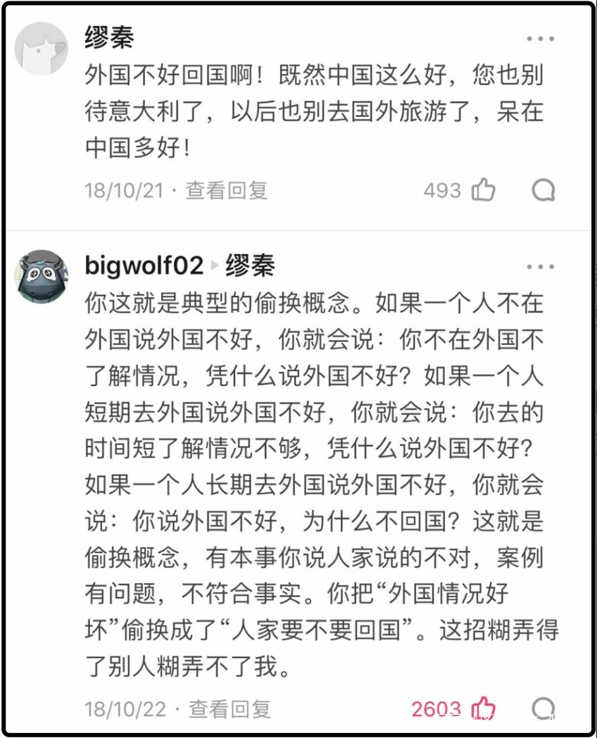 這兩年筆者發現,這些帶路黨的攻擊性邏輯其實很規律:你在國內的時候,他們説你沒出過國,不瞭解實際情況,説得不客觀,要你閉嘴;可一旦你説自己在國外,去了現場,提出對西方社會的質疑,他們馬上就説“國外不好那你怎麼不滾回來”。這也是頗為有趣的邏輯。
