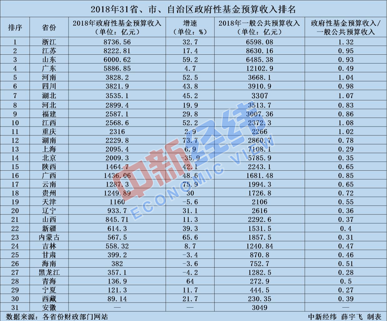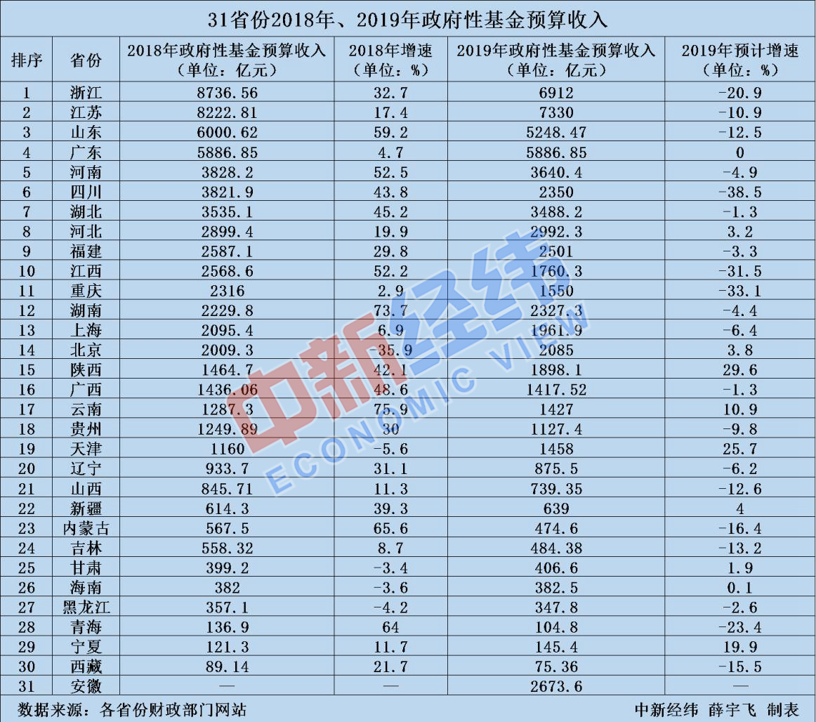 數據顯示,各省份的政府性基金預算收入差別較大,在31個省、市、自治區中,浙江、江蘇達到了8000億級,廣東為5000億級,河南、四川、湖北超過3000億元,河北、福建等7省份為2000億級,陝西、廣西等5地為1000億級。西藏政府性基金預算收入最低,為89.14億元。安徽省未公佈2018年政府性基金預算收入。