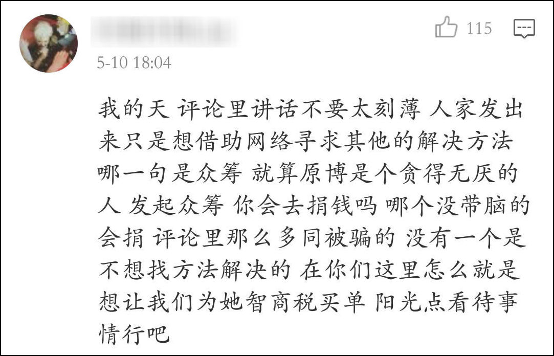 在這其中,有人奚落涉事博主的智商,也有人質疑她的經歷是否屬實,但有多數的網友還是在安慰博主,希望她能夠堅強面對。博主也表明態度,自己是在尋求幫助沒有錯,但是她仍然在積極地解決問題,並不是想通過獲得關注從而達到募款紓難等不良目的。
