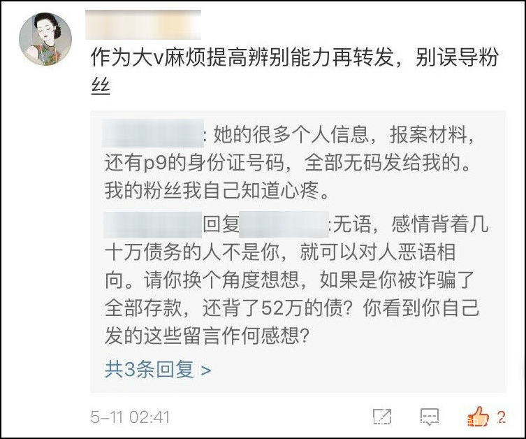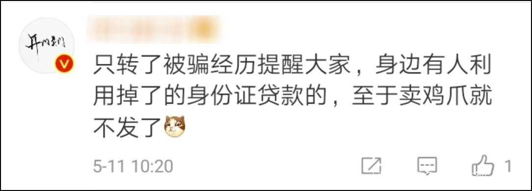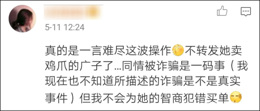 也許在整起事件當中,博主受騙的經歷是真的,她某種程度急中生智,想到要賣雞爪還貸也是真的,畢竟我們不能去苛求一個受害人方方面面都要做到完美。而幾次轉發博主微博的後面這個大V又表現得非常的“豬隊友”,可以説是變相地推高了質疑的聲音。