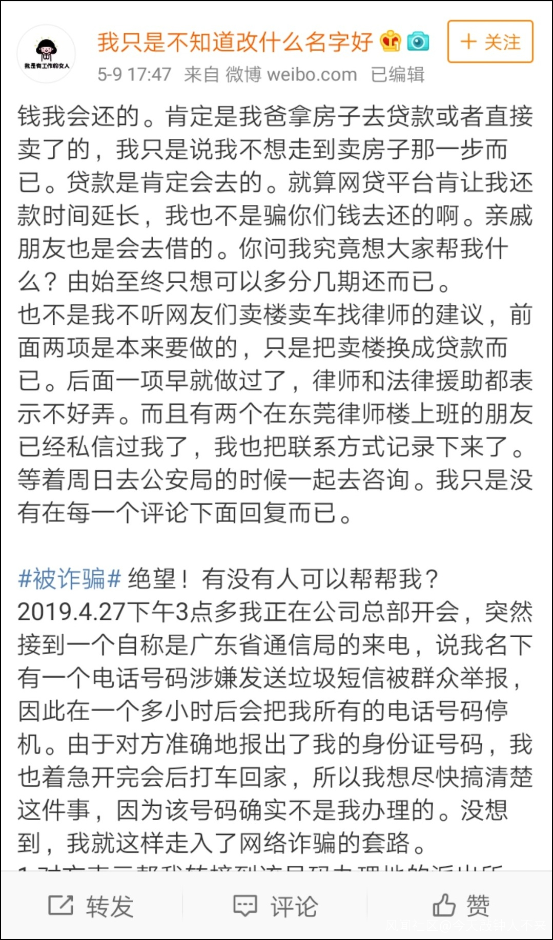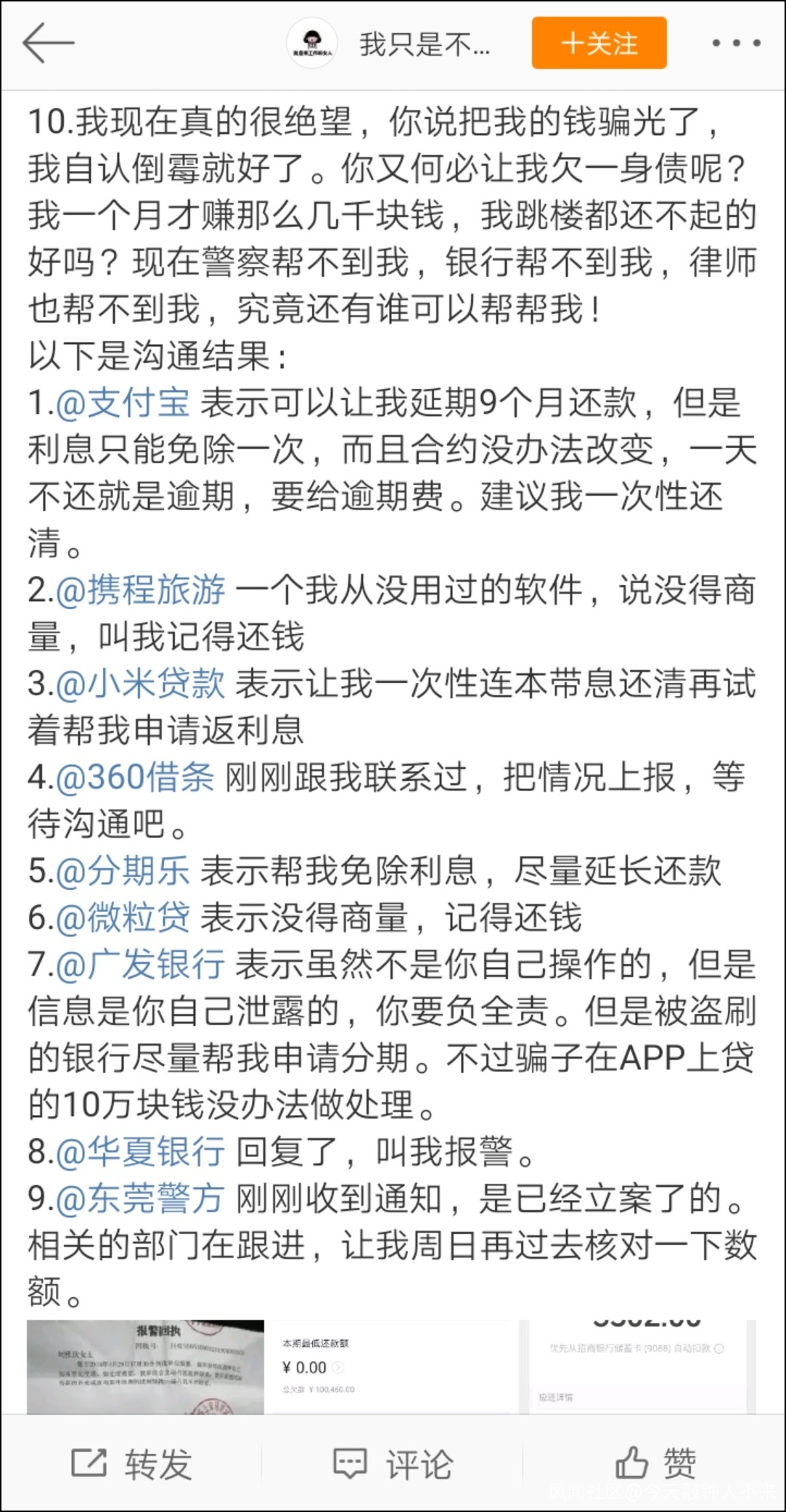另外,詐騙分子還要求受害人不能登陸微信,博主也聽從了。故而在其父母報警、慌慌張張四處尋人的時候,就這麼一直沒有找到她。不過,這個時候的博主還是認為,又有人在利用自己的賬户洗黑錢。如前一天一樣,她繼續在網絡平台貸款,繼續給所謂的“安全賬户”匯款。