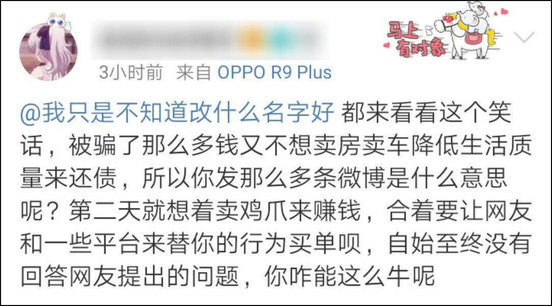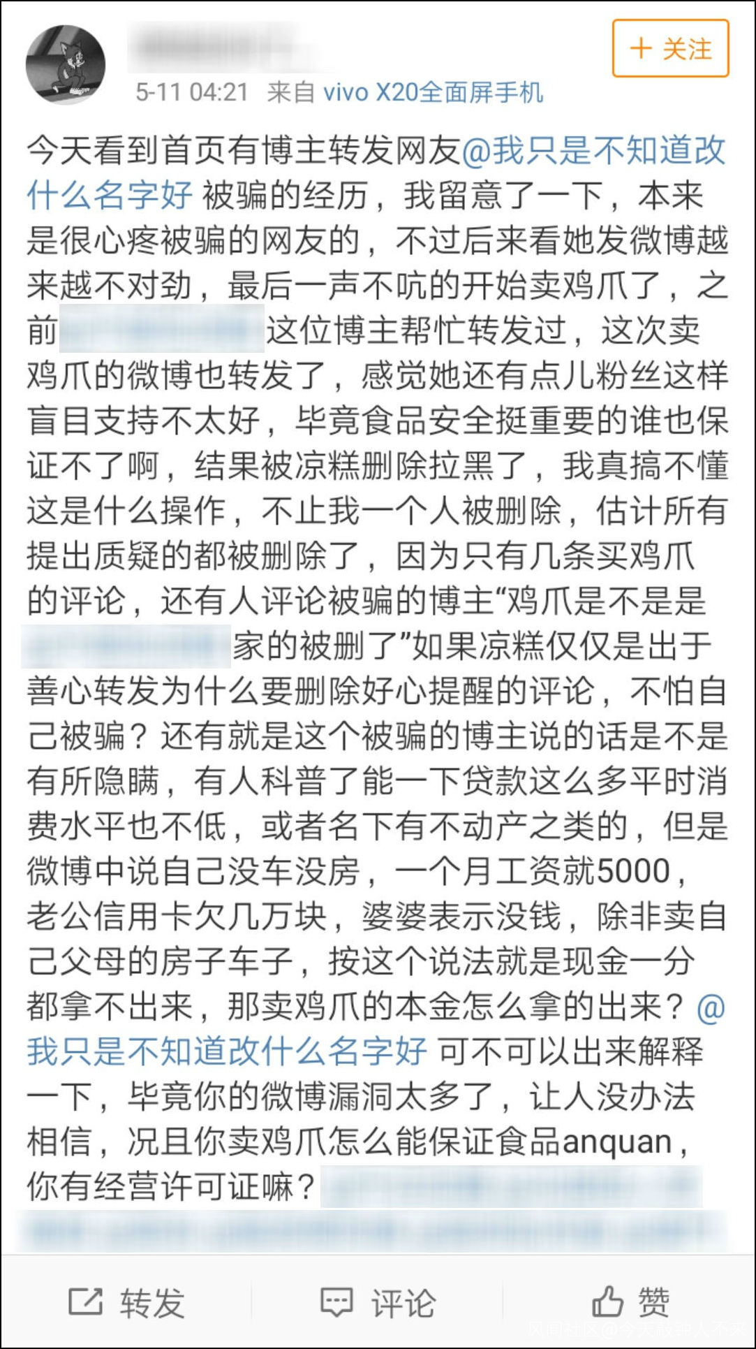 其中,有一位網友此前還是很同情受害博主的遭遇的,但是她看到一位知名大V轉發了受害博主售賣雞爪的微博後,就覺得這位大V連受害博主雞爪售賣的微博都轉發有點不妥,於是在評論區提出質疑,結果立馬遭到大V拉黑。