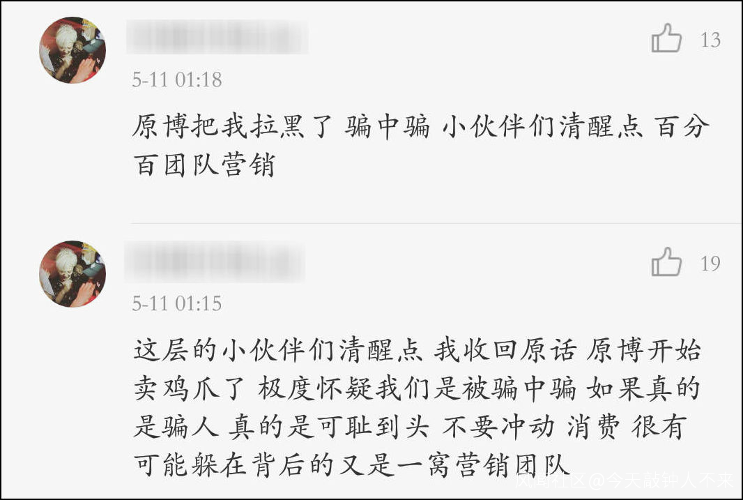 現在已經有很多網友表示,只會轉發前一則描述受騙經歷的微博,而不會轉發第二則微博為受害博主賣雞爪的行為站台。怎麼想,都覺得網友做出這樣的選擇也是無可奈何呢。