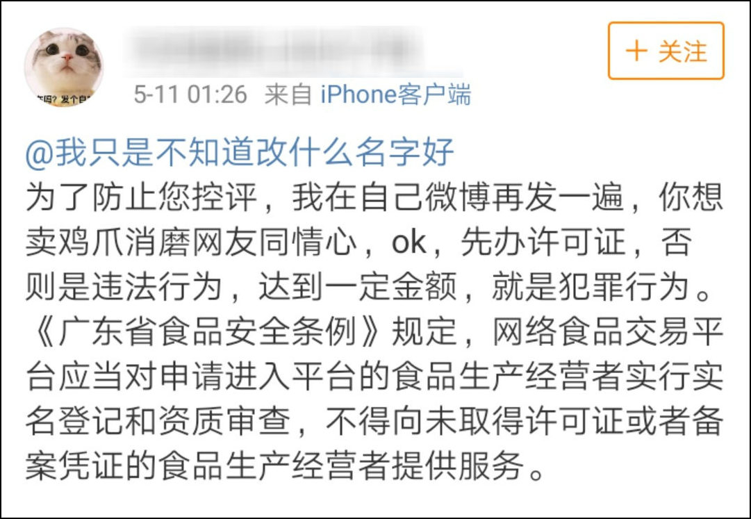 儘管如此,還是有很多的網友在質疑受害博主賣雞爪的行為其實是想利用社會大眾對於弱者的同情,讓網友為她的個人行為買單。其中,有網友指出,博主的行為或涉嫌無證經營↓↓