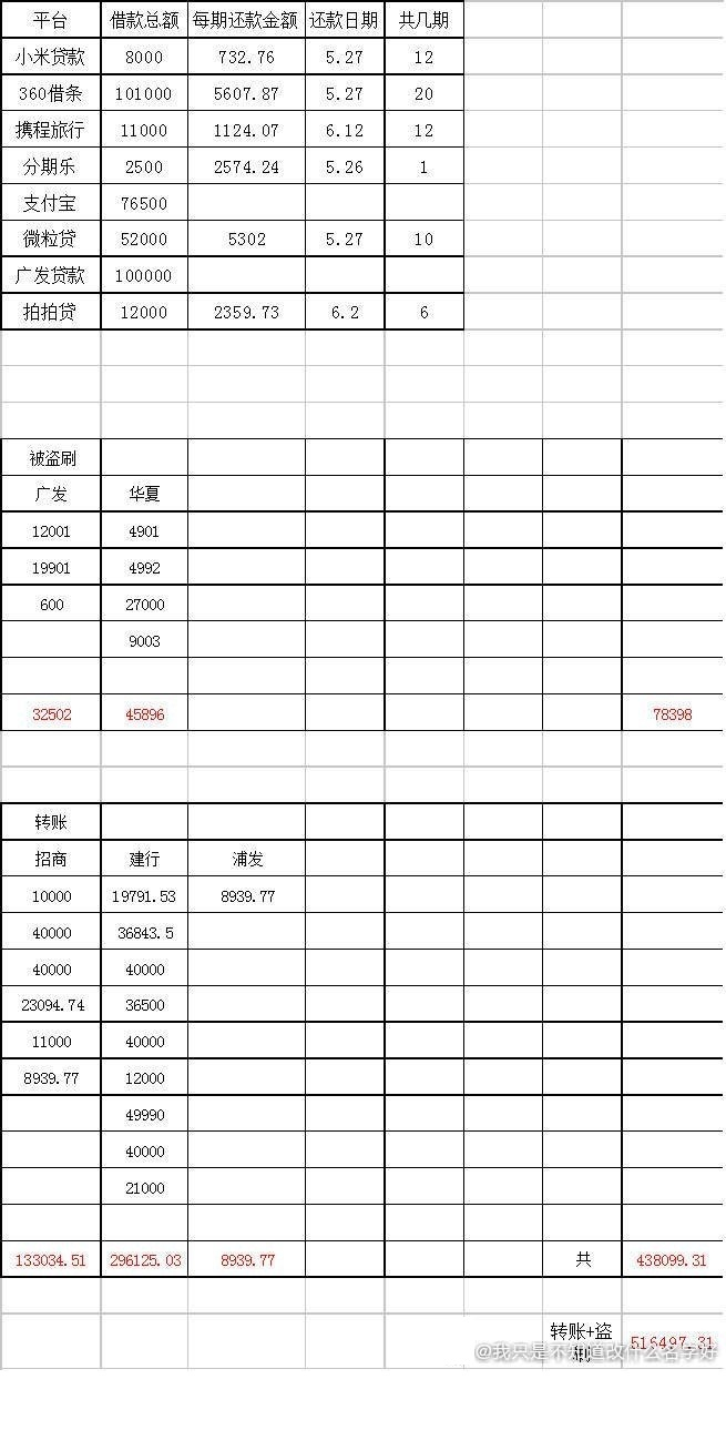 日前,微博博主@我只是不知道改什麼名字好 發文稱,自己遭遇到電信詐騙。而這起詐騙不止於獲取受害人銀行卡信息、盜轉賬户餘額那麼簡單,詐騙分子還誆騙受害人在多個平台上進行貸款,導致受害人負債一身。整起詐騙中,受害人累計損失達到將近52萬元之多。