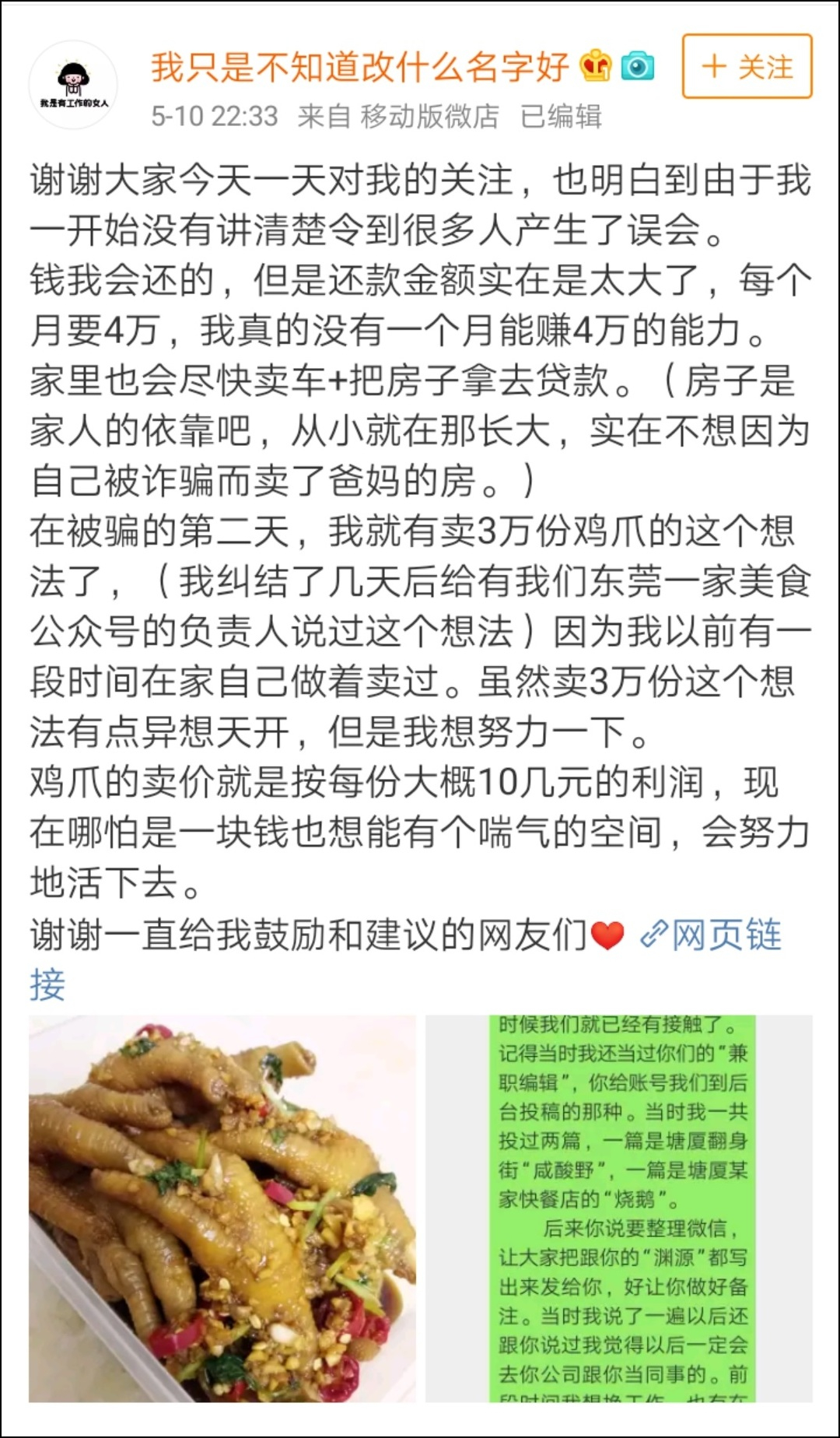 5月10日,博主發文稱,在受騙的第二天,自己已經有了要賣3萬份雞爪還款的想法,為此糾結了好幾天,甚至還徵求過東莞本地的一家美食公眾號負責人的意見。她介紹説,自己之前有一段時間就在家裏做過雞爪拿到微店上售賣,此番受騙再執舊業算是某種程度的“病急亂投醫”。