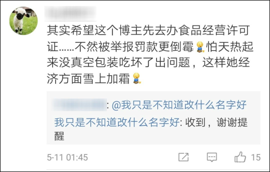 目前,涉事博主稱,自己已經收到好心網友的提醒,會辦理好手續,讓自己可以合法地利用個人一技之長賺錢還貸。而我們也注意到,在早前是博主徵求東莞本地一家美食公眾號負責人意見的聊天截圖中,她在事前已經想到了網友們可能存在的疑慮。