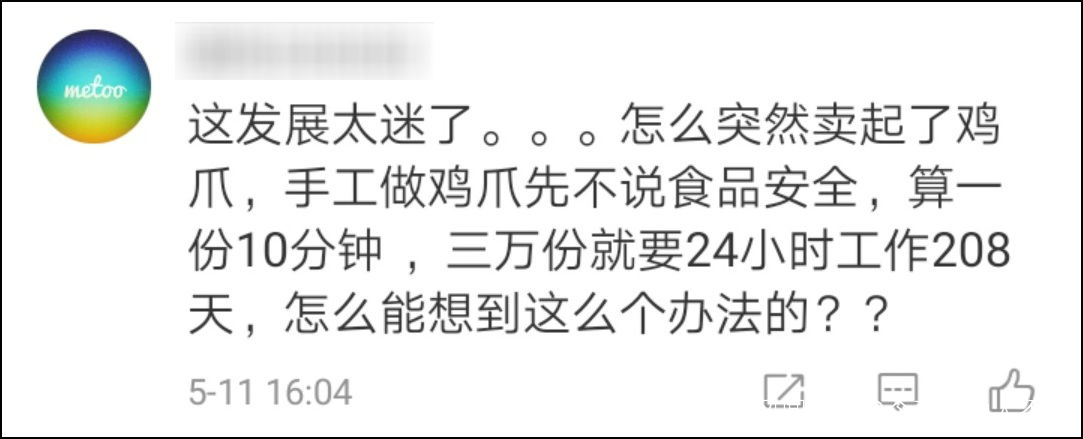雖然博主表明自己賣雞爪的想法是在受騙的第二天就萌發的,但是在不少網友看來,還是有些突然、令人感到不可思議的:怎麼上一秒還是電信詐騙的受害人,還未來得及同情,下一秒就變成了微店店長,開賣3萬份雞爪了呢?