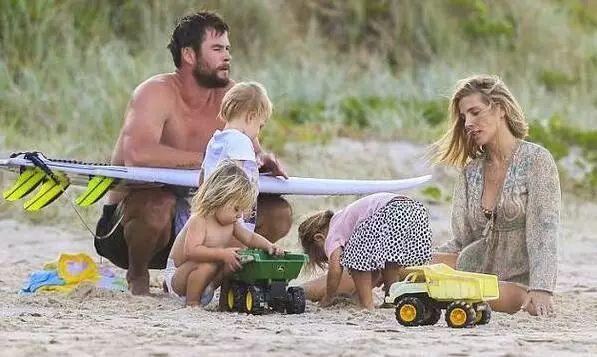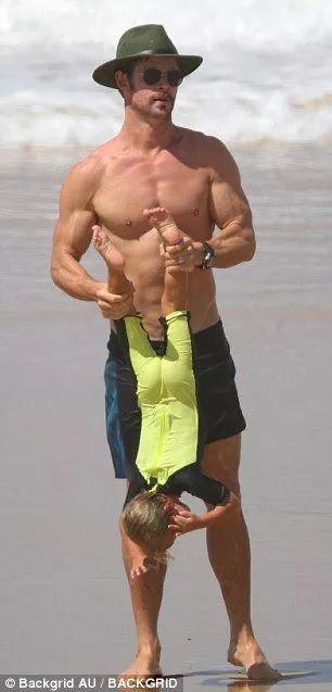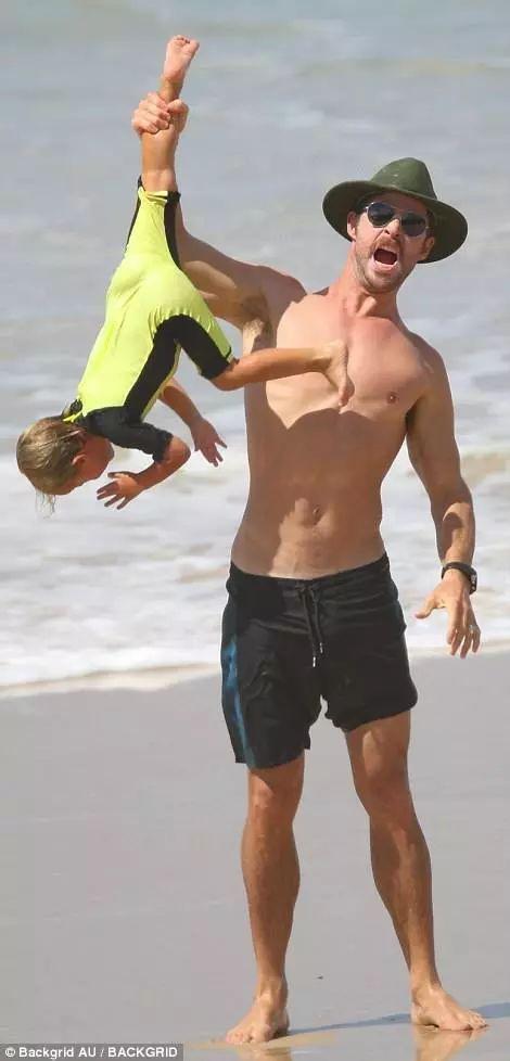 而同樣是父女倆,同樣是海邊玩耍,“雷神”克里斯⋅海姆斯沃斯和女兒的畫風就變成了這樣……錘哥,您這娃是買錘送的嗎?