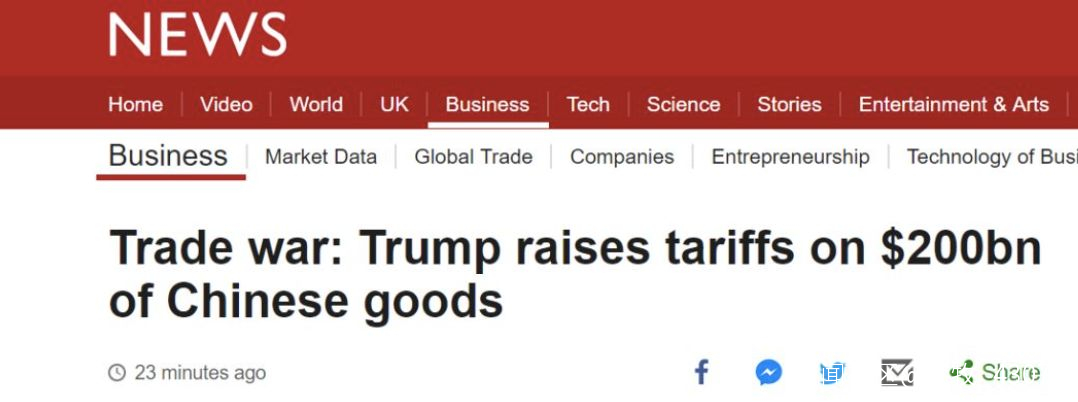 美方將2000億美元中國輸美商品加徵的關税從10%上調至25%。