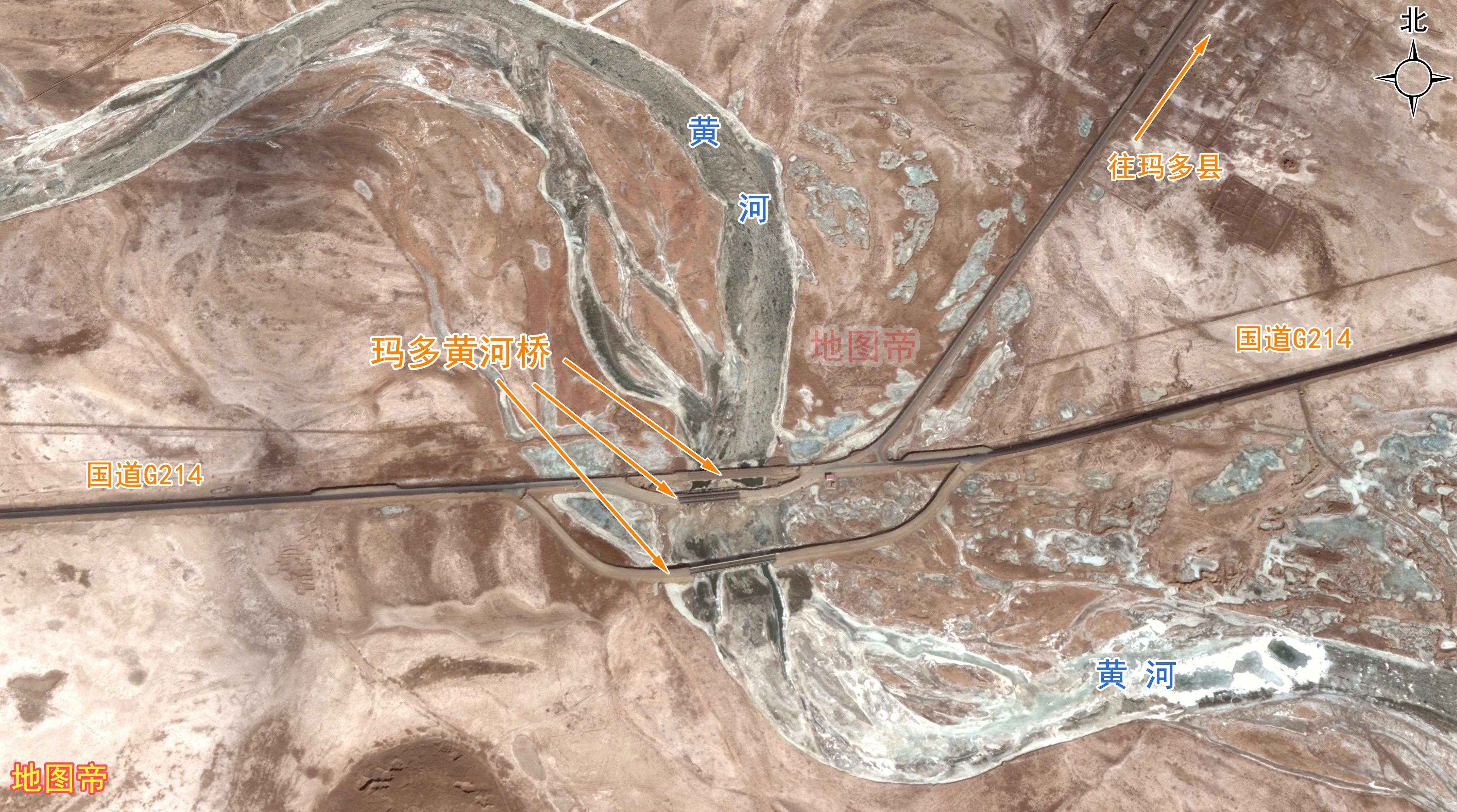 瑪多黃河公路大橋(瑪多黃河橋),位於青海省果洛藏族自治州瑪多縣。瑪多黃河橋是1966年修建的,是黃河干流上第一座鋼筋混凝土大橋,有“黃河第一橋的“美譽。後來開通的國道G214,也在這裏修建了大橋。這幾座橋肩並肩,它們的上游就是黃河源區。