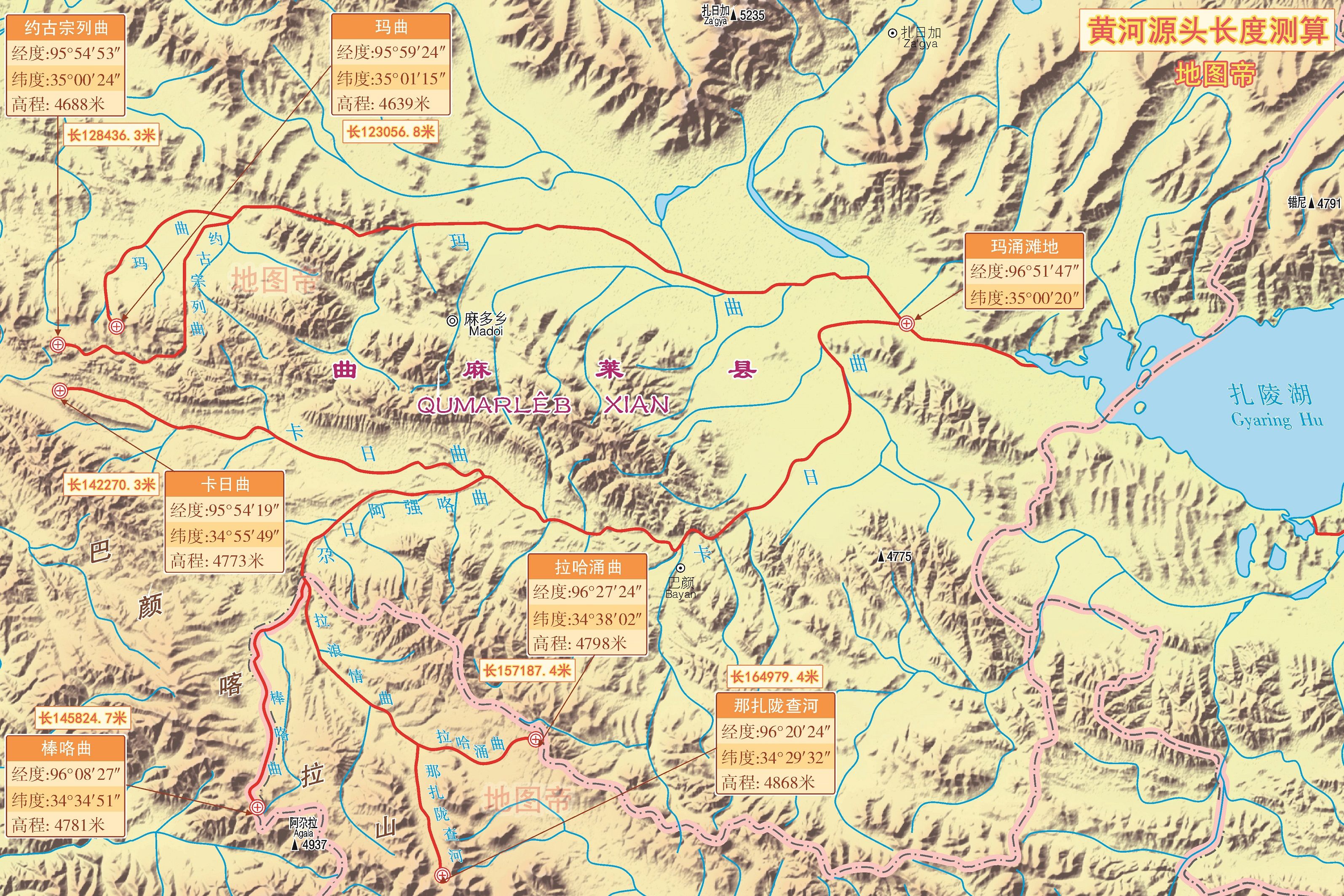 最後我們按照從上游到下游的順序,再來梳理黃河的名稱:那扎隴查河-拉浪情曲-尕日阿強咯曲-卡日曲-黃河。