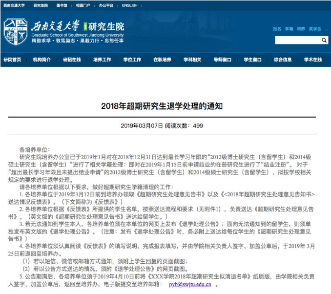 對於“超出最長學習年限且未提出結業申請”的2012級博士研究生(含留學生)和2014級碩士研究生(含留學生),擬按學校相關規定的要求進行退學處理。