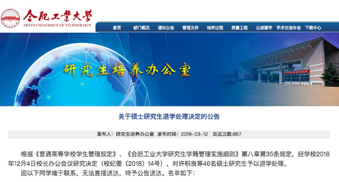 對46名碩士研究生予以退學處理,因其在學校規定的最長學習年限內未完成學業,或超過學校規定期限未註冊而又無正當理由,且未經請假離校連續兩週未參加學校的教學活動。